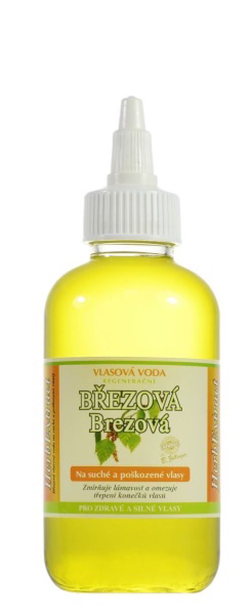 Březová vlasová voda regenerační je určena na suché a poškozené vlasy. Obsahuje březový extrakt, který spolu s glycerinem vyživuje vlasovou pokožku, zmírňuje lámavost a omezuje třepení konečků vlasů poškozených např. barvením nebo fénováním. Složení: Agua, Alcohol, Betula Alba, Glycerin, Parfum, Geraniol, Limonene, Linalool, Citronellol, Benzyl Benzoate, Amyl Cinnamal, Citral, Coumaron
